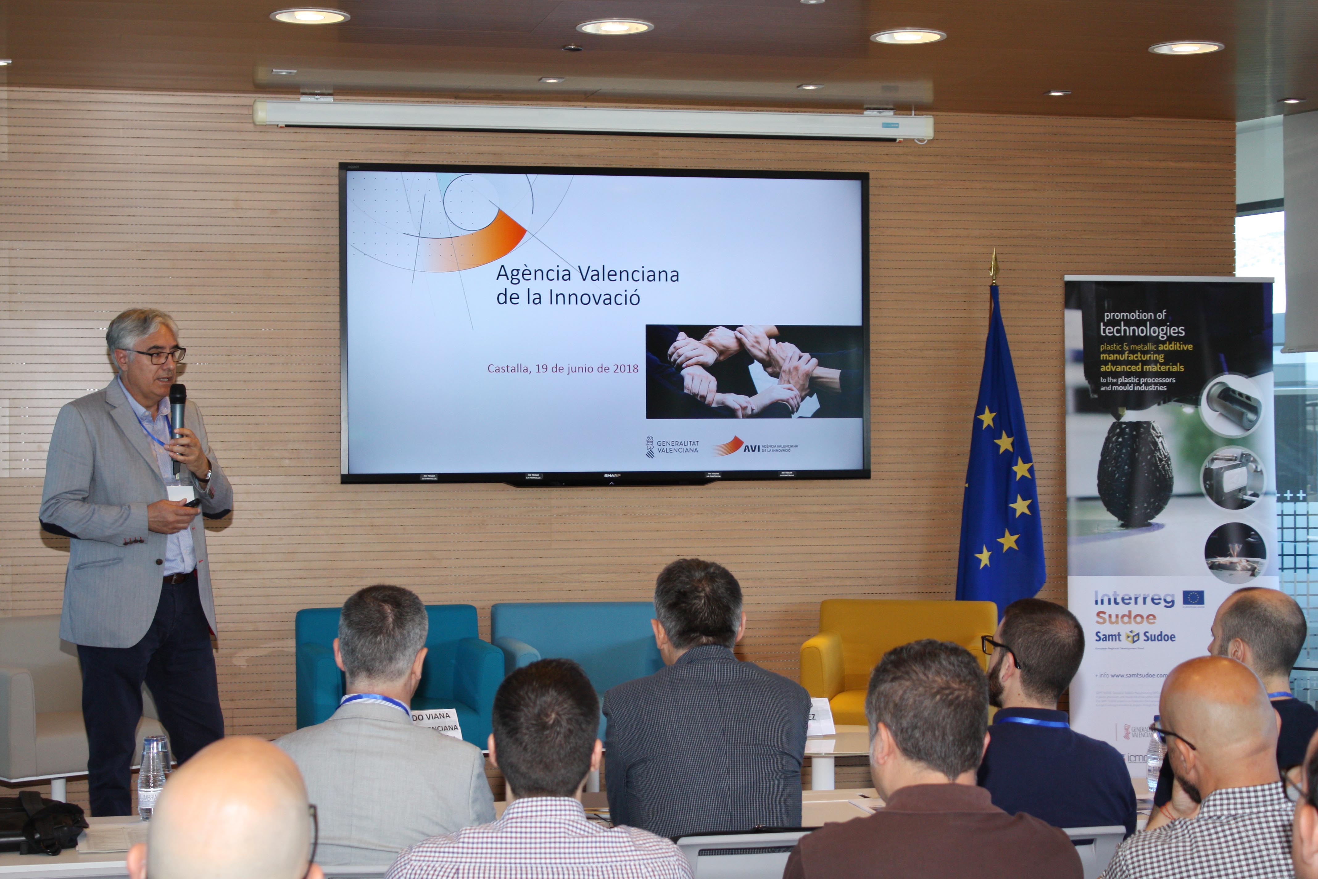 En un primer bloque de presentaciones, se realizó la apertura por parte del Jefe de Servicio de Cooperación del Sistema Valenciano de Innovación de la Agencia Valenciana de Innovación, AVI, Eduardo Viana, que fue seguida por la presentación por parte de Alejandro Fernández de Mera, Project Manager de CEIV de dos de los primeros resultados del proyecto SAMT Sudoe: